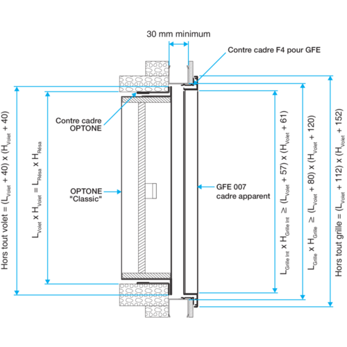 La grille GFE - Cadre Apparent est à encastrer directement dans la paroi, devant le volet de désenfumage. Le cadre apparent offre une esthétique discrète dans le prolongement de la paroi, tout en couvrant la réservation.