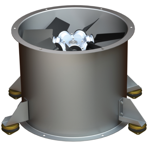 - pieds et plots anti-vibratiles, contre-brides et manchettes souples des deux côtés, virole longue pour l’accès au moteur au travers de la trappe de visite.