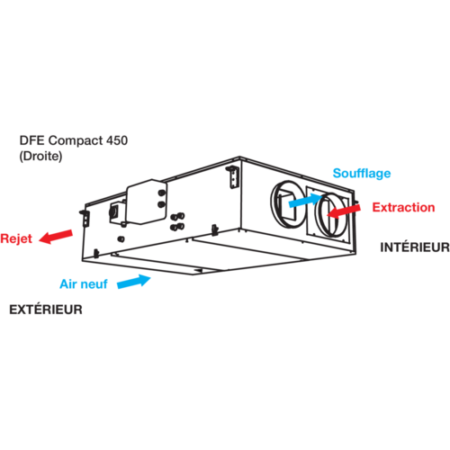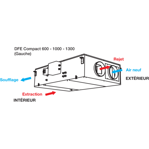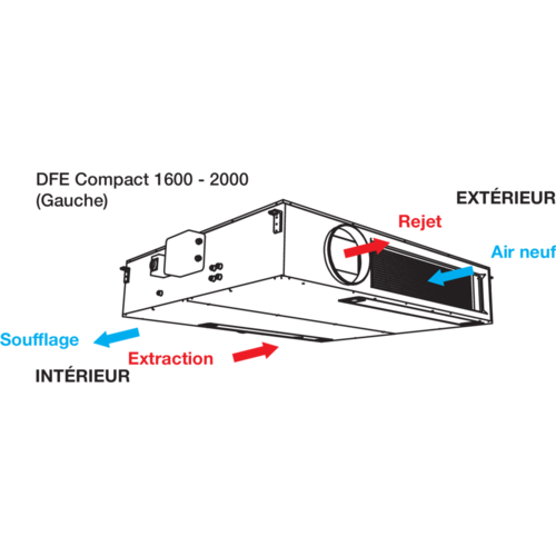 L’unité DFE Compact est une unité de traitement de l'air avec échangeur à échangeur contre-flux. Elle peut être montée dans le plafond grâce à ses petites dimensions.